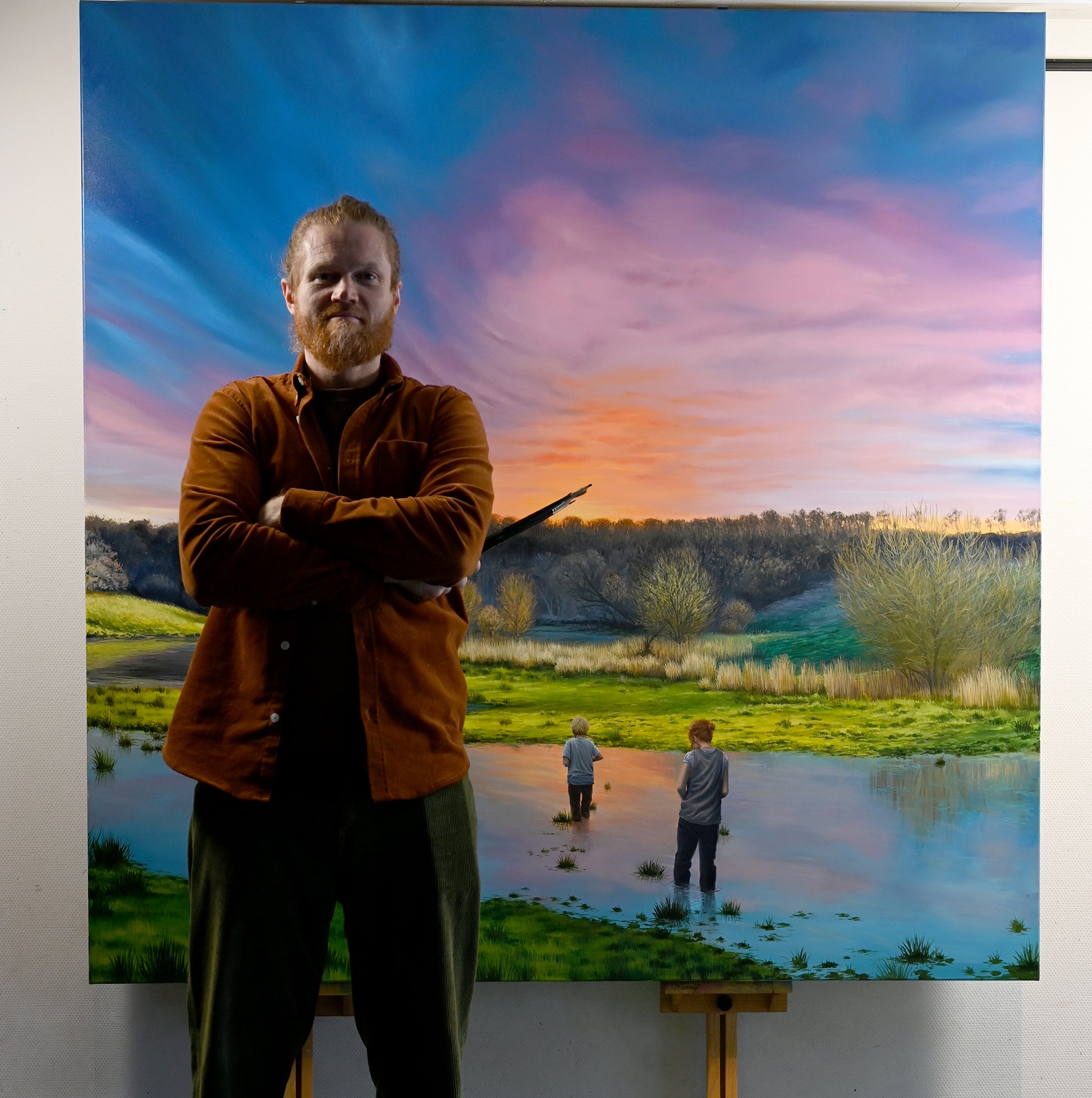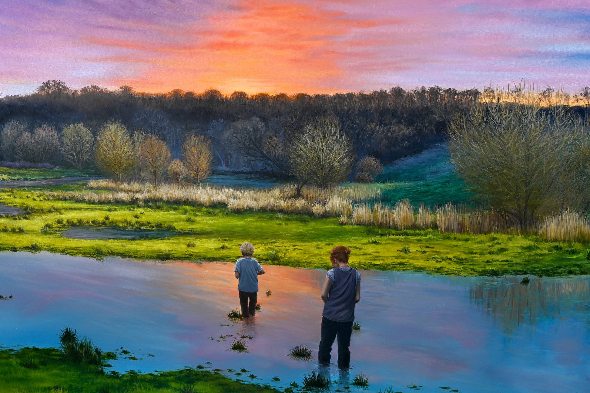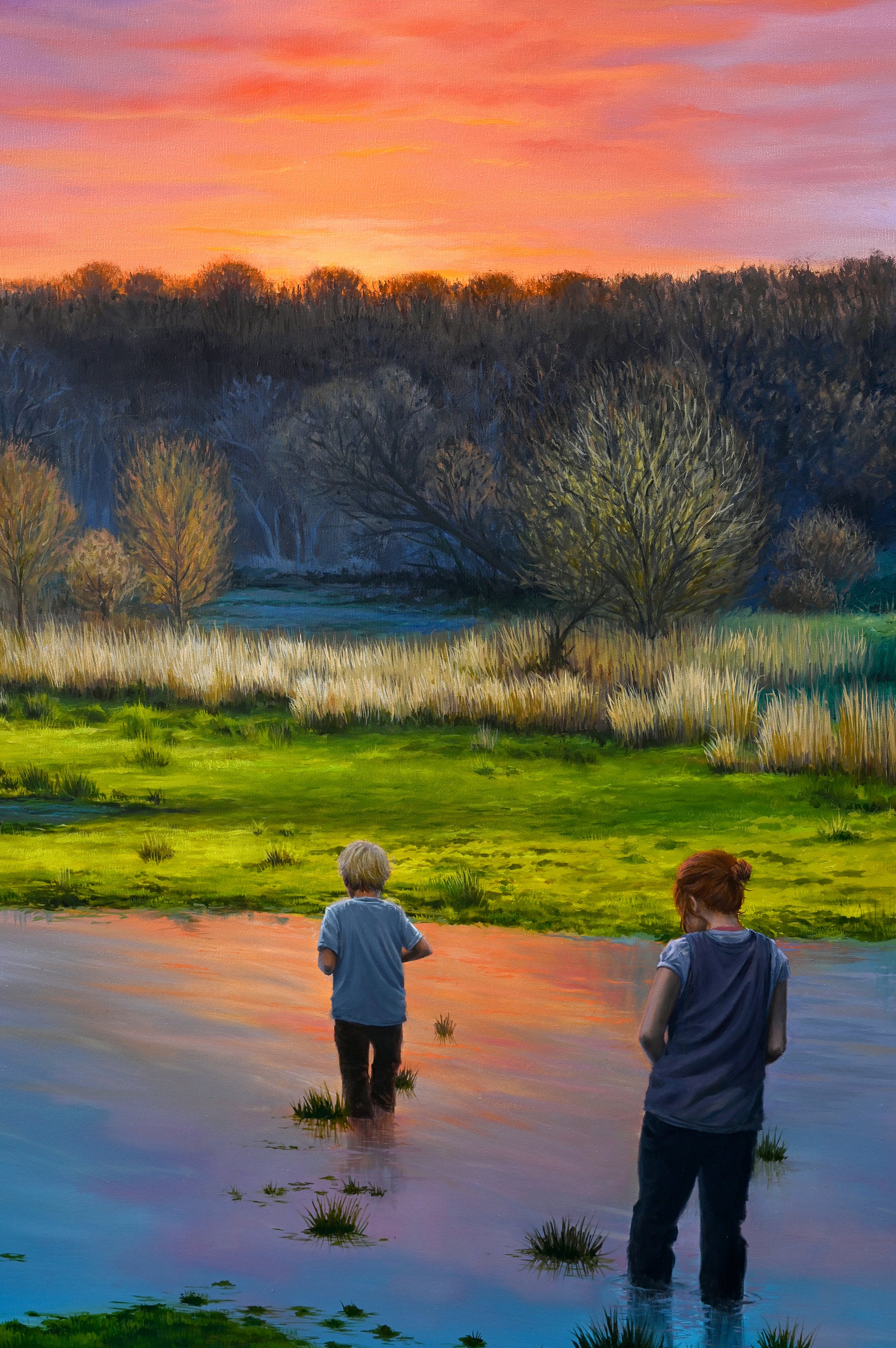 De to figurer bevæger sig gennem vandet som mellem verdener — mellem det, der var, og det, der endnu ikke har fået form. Landskabet omkring dem er ikke blot et sted, men en sindstilstand: barndommens indre terræn, hvor tid og erindring flyder sammen.