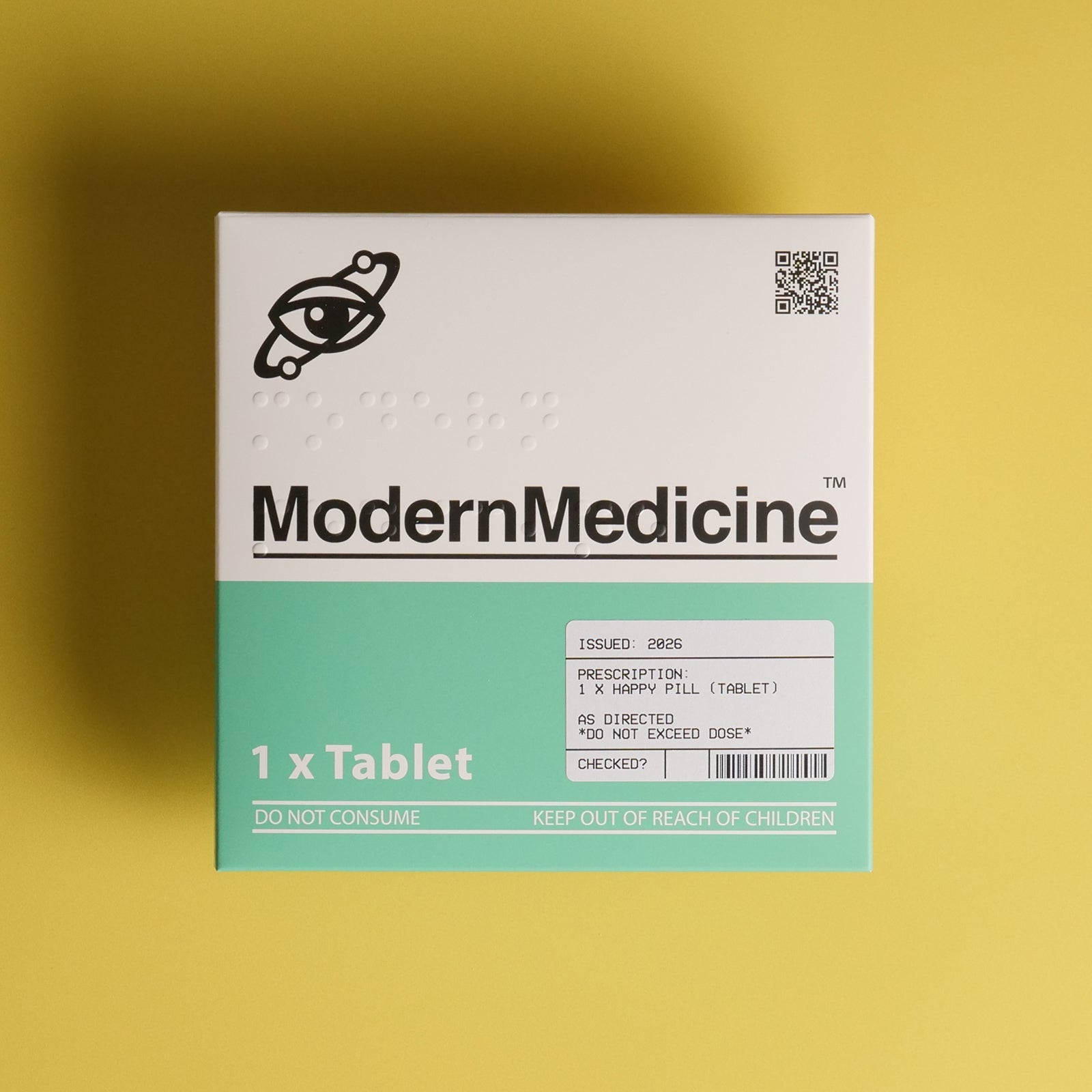 Overdimensionerede 'Happy Pill'-motiver leveres hver i en specialfremstillet, klar blisterpakning med metallisk kortbagside, der har et holografisk, varmfolieret 'Imbue Eye'-mønster på bagsiden. Hver enkelt er pakket i en specialfremstillet trykt og præget æske.