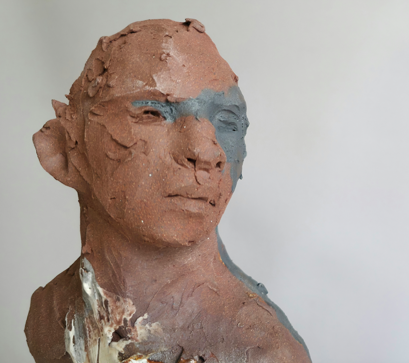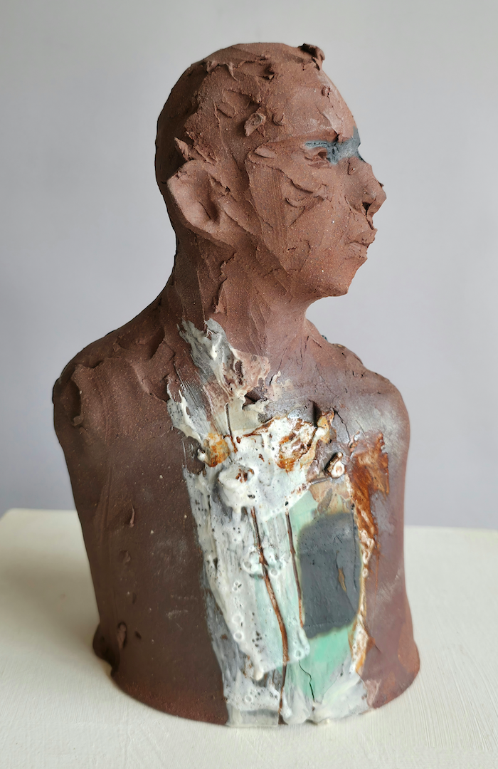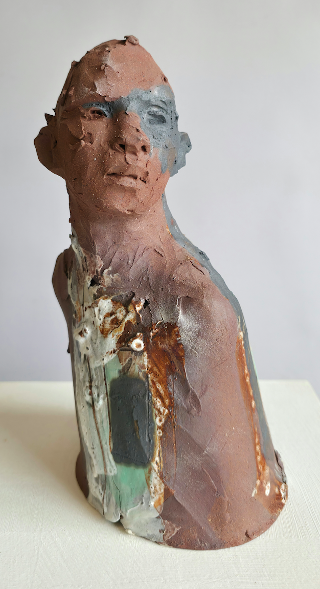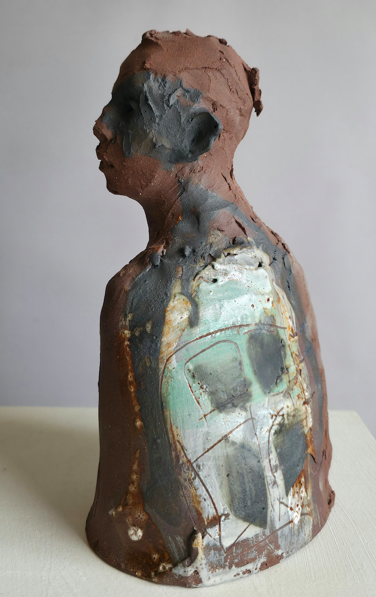 High fired terracotta bust with images of ‘windows’ and heavy iron wash.