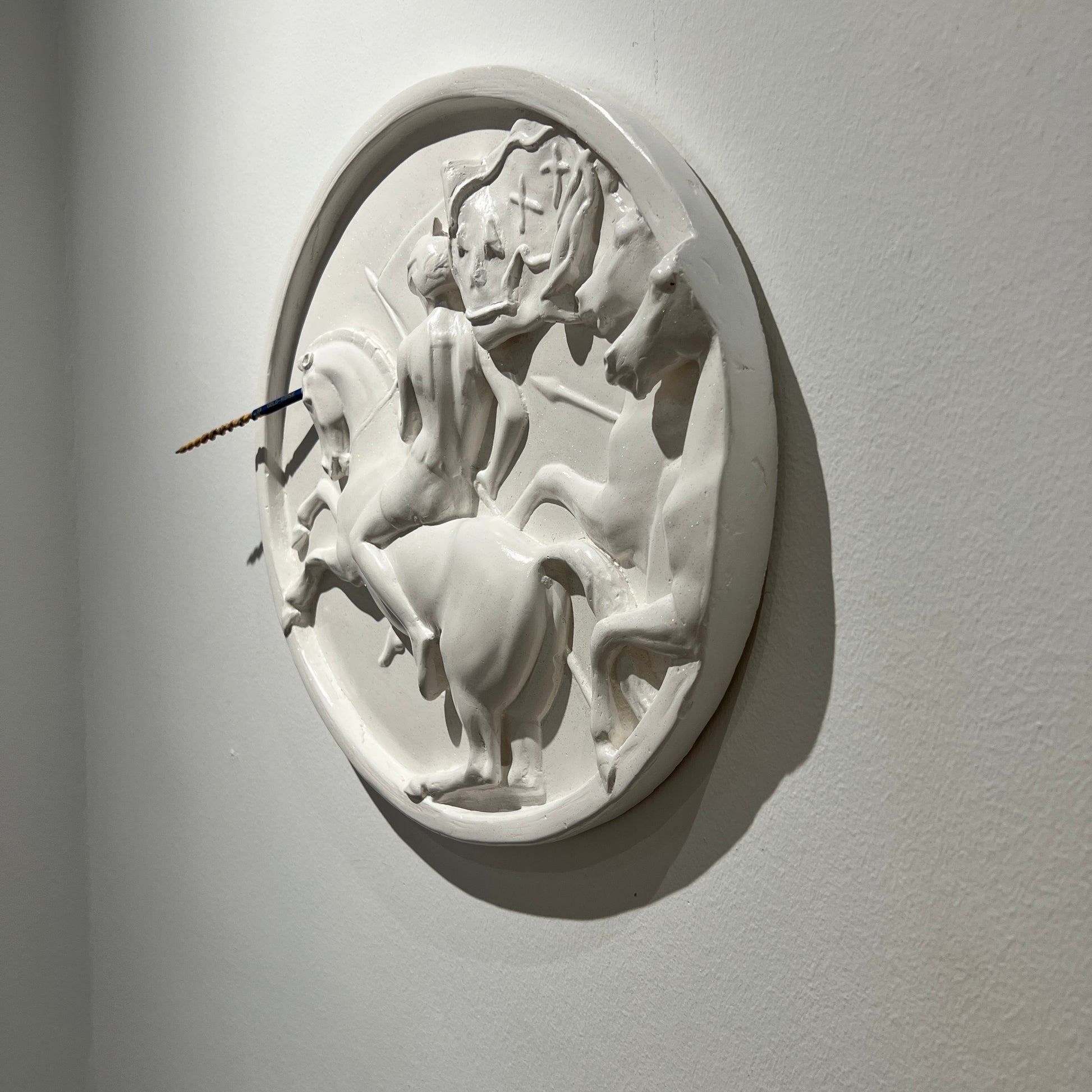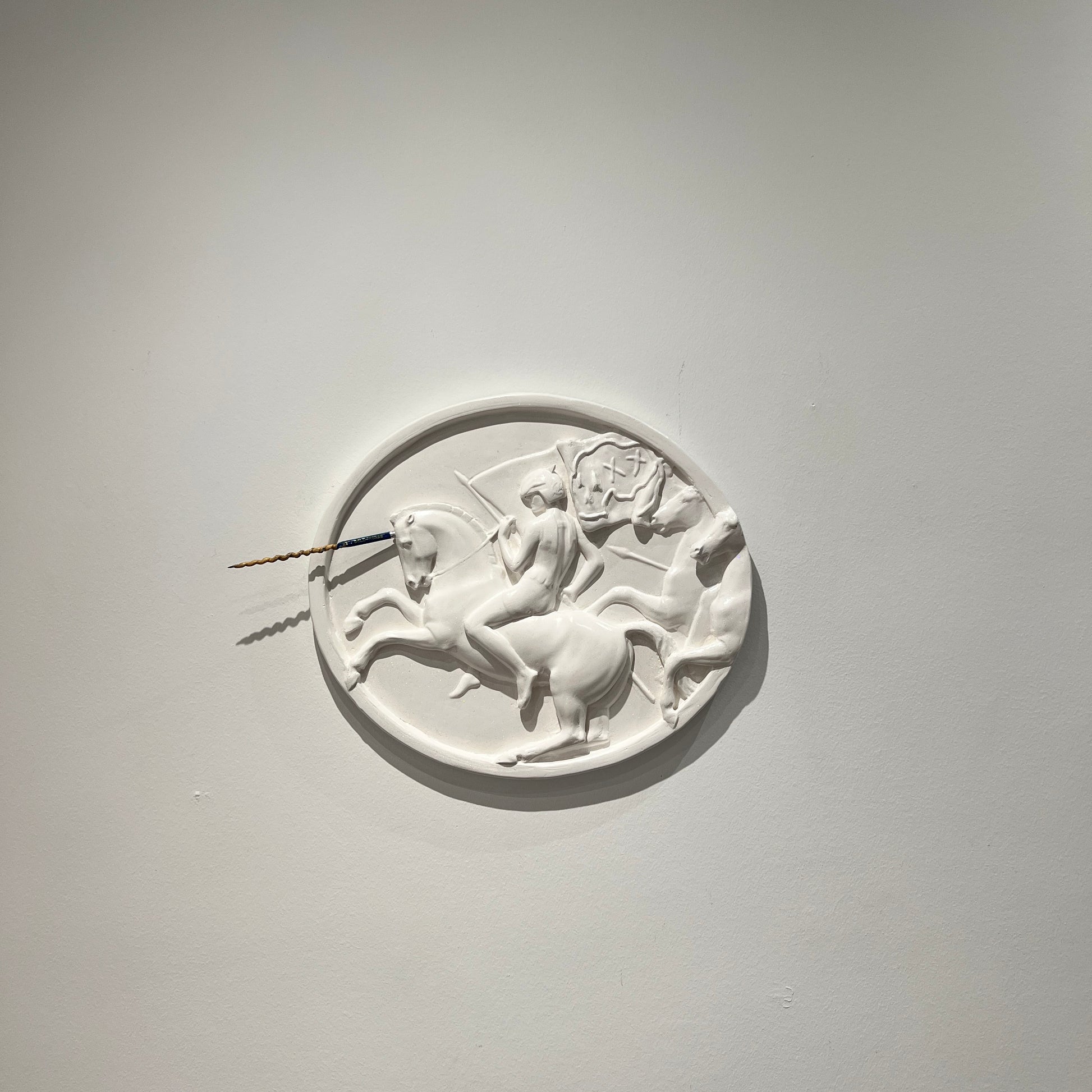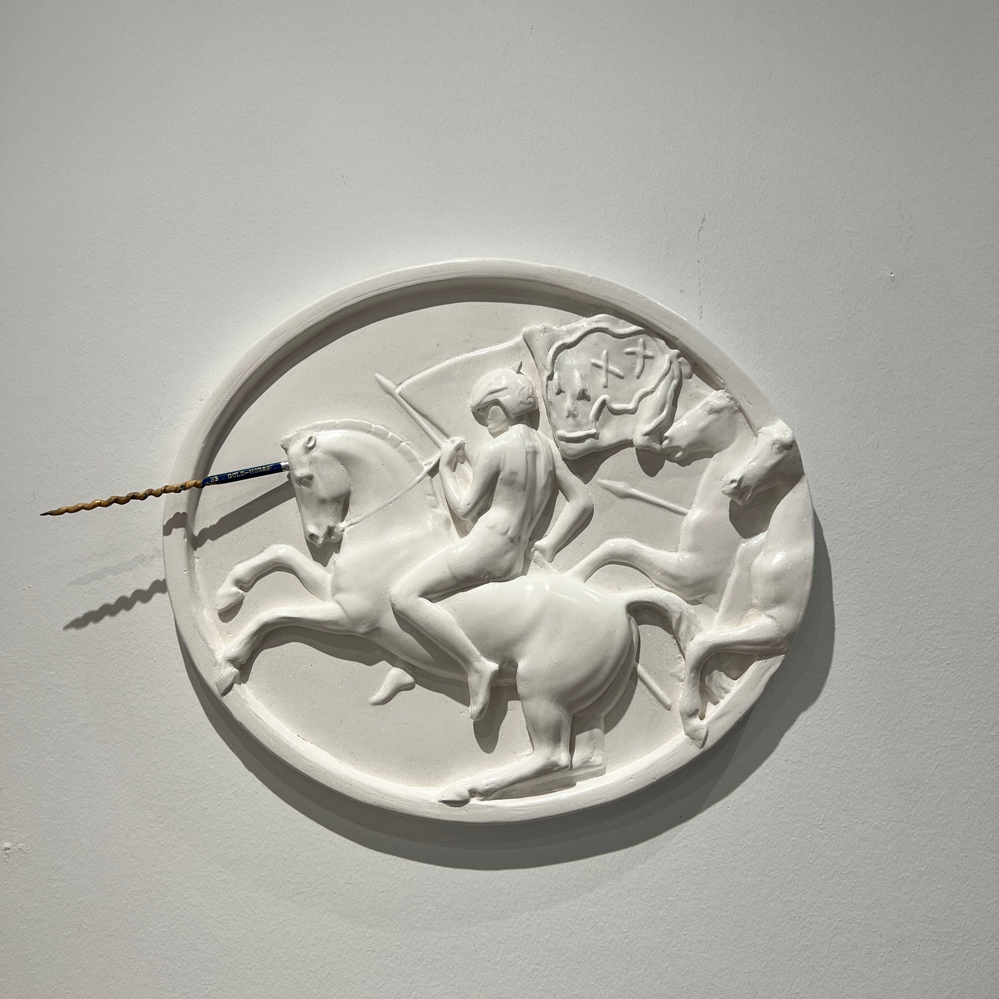 The relief shows the Anthropologist wearing her characteristic helmet and carrying the banner previously presented in the work Riot!.
