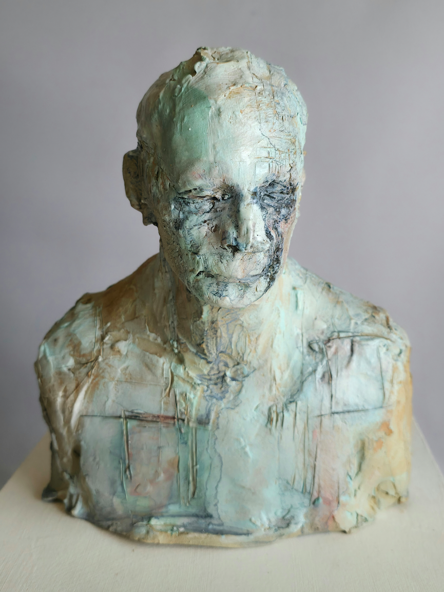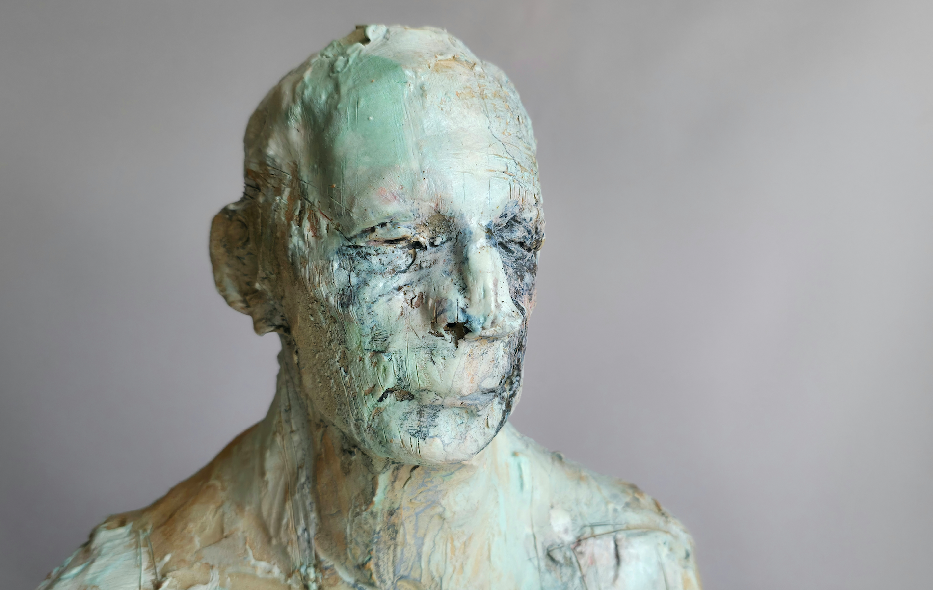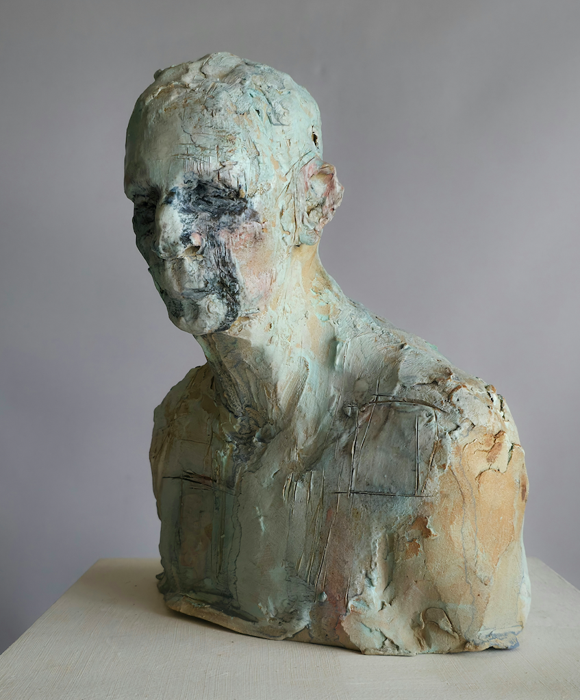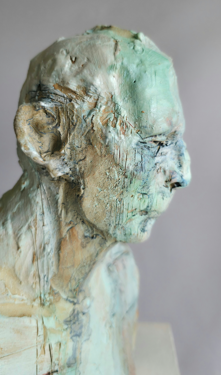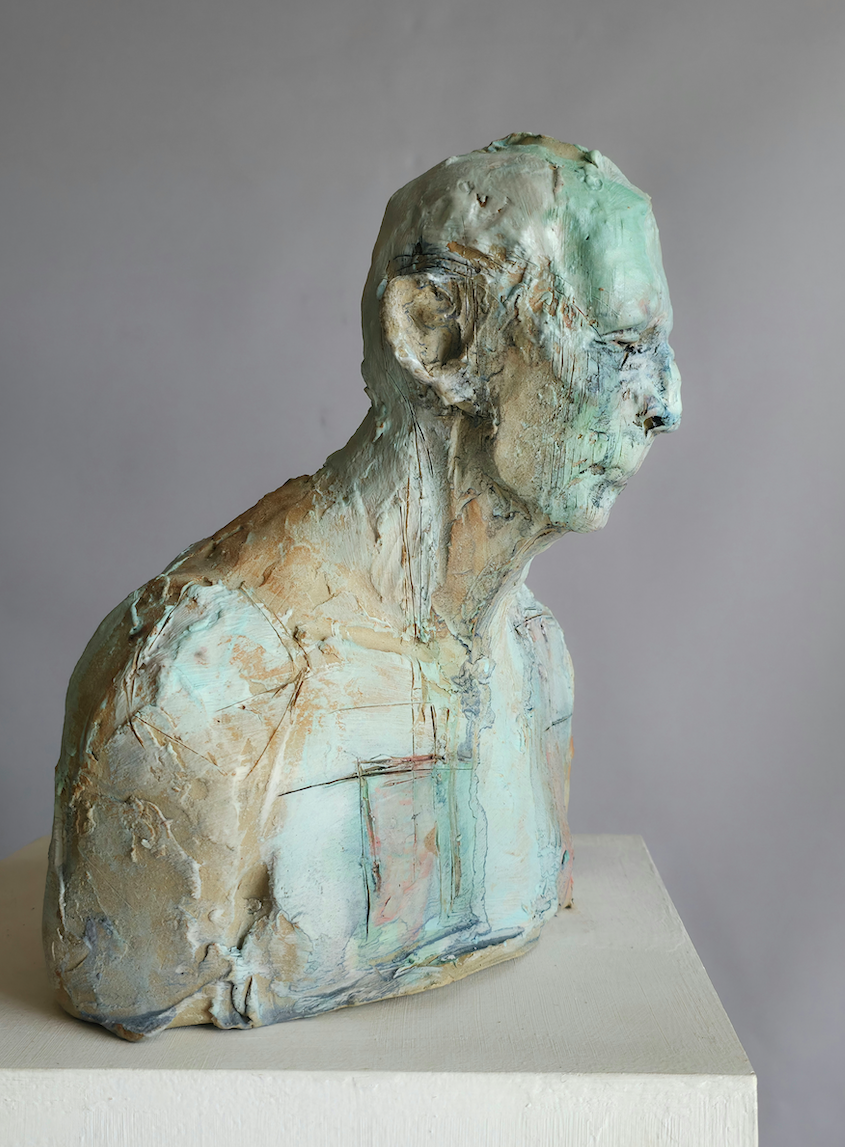 Stoneware bust with sgraffito, blue/grey and green glaze.